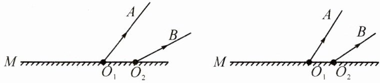 7. 如图所示,$O_{1}A$、$O_{2}B$是平面镜前一点光源S发出的光线经平面镜M反射后的两条反射光线,请在图中标出光源S和像点$S'$的位置,并完成光路图。