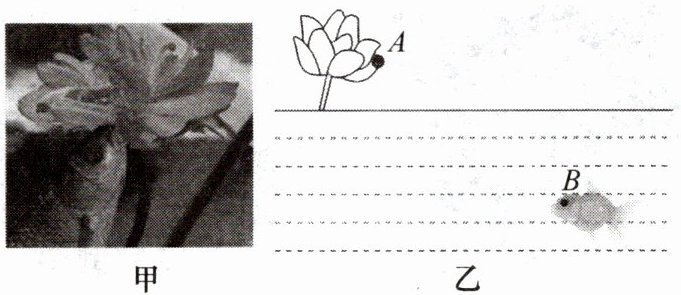 15. 古都开封风景宜人,每逢夏季荷花盛开更是吸引了不少游客;如图甲是一名摄影爱好者拍摄到的鱼儿咬食荷花的场景,请在图乙中画出鱼未出水面时看到荷花的大致光路图,A表示荷花、B表示鱼眼。