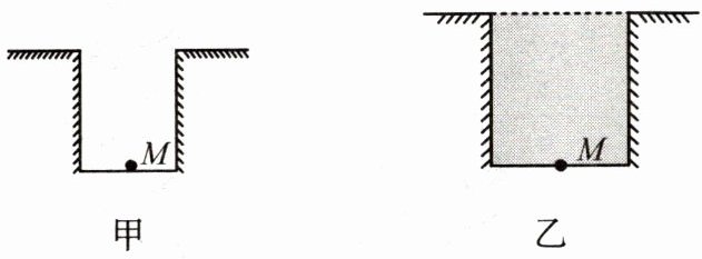 (2)一场大雨后,井中灌满积水,青蛙仍在井底M点“坐井观天”,请在图乙中大致画出青蛙通过积水能观察到的井外的范围。