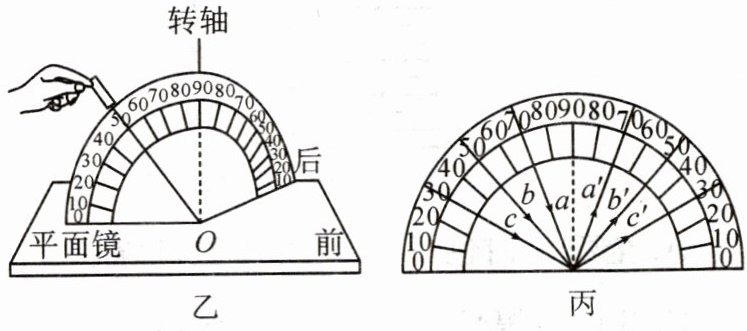 (填“前”或“后”)折转。(3)保持入射点不变,多次改变入射方向,在光屏上记录每次实验的光路a和a'、b和b'、c和c',如图丙所示。为了研究反射光线和入射光线的位置关系,发现左、右半屏相对应的光线关于转轴对称,可将此对称轴视为