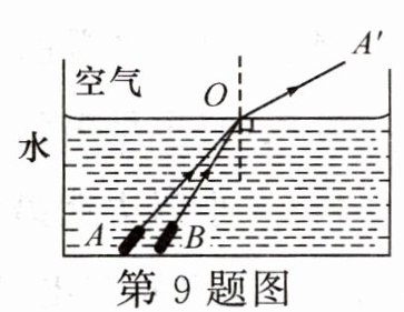 9.(2024·河南)如图,观光水池中,一束红光沿AO方向从水中射入空气,折射光线为OA'。若另一束红光沿BO方向从水中射入空气,请大致画出入射光线BO的折射光线,并标出对应的折射角r。