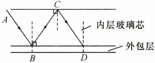 8. 光在玻璃纤维中的传输情况是光线每次由内层玻璃芯射向与外包层的分界面时,均要发生反射,光在不断地反射中沿内层玻璃芯向远处传播。如图所示,入射光线AB的入射角为30°,当其增加10°时,∠BCD=80°,CD光线的入射角将