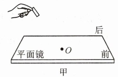 (1)将平面镜置于水平桌面,如图甲所示。激光笔的光束射向平面镜上O点,在平面镜上方喷水雾,从前向后观察,可在镜面上方看到
