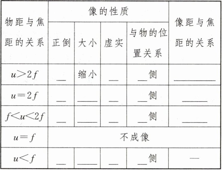 故答案依次为:倒立;实像;异;$f\lt v\lt2f$;倒立;等大;实像;异;$v = 2f$;倒立;放大;实像;异;$v\gt2f$;正立;放大;虚像;同。