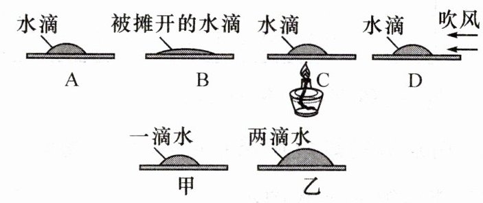 两图的对比,可以得出水蒸发的快慢与水的表面积有关。(4)小军同学猜想水蒸发的快慢还可能与水的多少有关,于是继续进行了如下探究:在相同环境下的甲、乙两块相同的玻璃板上分别滴上一滴和两滴水(如图),观察并比较两图中哪块玻璃板上的水先蒸发完。从实验设计环节看,你认为他存在的主要问题是