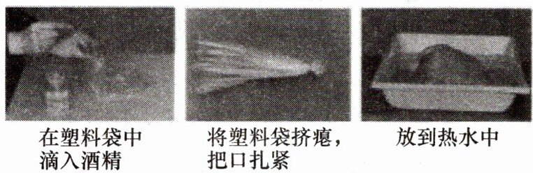 1. 如图所示,在透明塑料袋中滴入几滴酒精,将塑料袋挤瘪,排尽空气后用绳把口扎紧,然后放入热水中,会看到塑料袋鼓起来,是由于袋内液体酒精变成