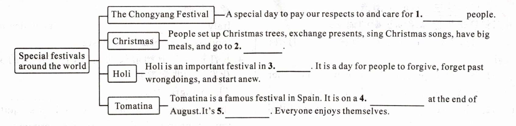 1. 【教材原句】It's a time to be with family, have fun outside, and show love for the elderly. 这是一个与家人相聚、在户外尽情玩乐以及向老人表达关爱的时刻。