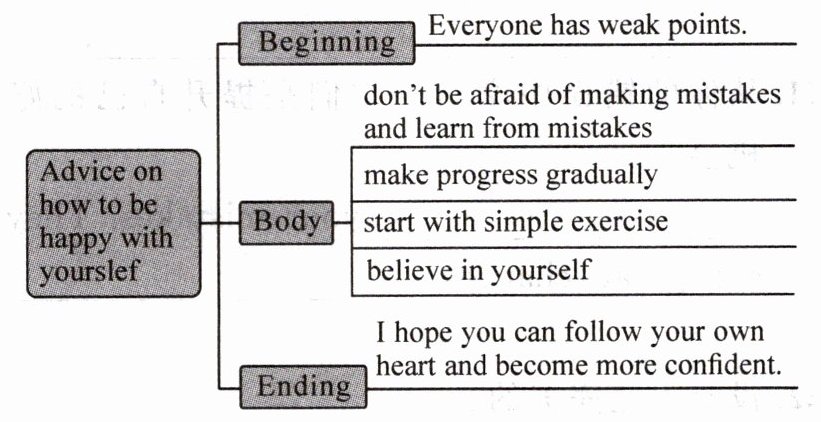 1. worry about 2. feel bad about 3. be unhappy with 4. make mistakes 5. weak points 6. have trouble in 7. believe in oneself 8. encourage oneself 9. feel confident to do 10. be proud of 11. share... with ... 12. start with 13. take small steps 14. be able to