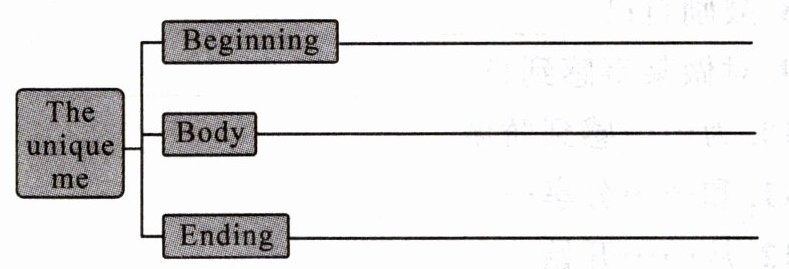 【审题指导】1.介绍自身闪光点 2.说明文 3.第一人称 4.以一般现在时为主【思路点拔】Beginning: Strong points and weak points Body: Dream job Ending: How to be happy with myself【小试身手】One possible version: The unique me My own strengths make me unique. I always come up with new ideas and I am not afraid to take on challenges. However, I also have my weak points. Sometimes, I can't stand in others' shoes and refuse to listen to others' opinions. In the future, I want to become an artist. I love drawing and painting, and I believe I have the talent to make a career out of it. To be happy with myself, I focus on my strengths. I keep practicing drawing to make it better. And I'm trying to overcome my shyness. I share my ideas bravely and that helps me become more confident.