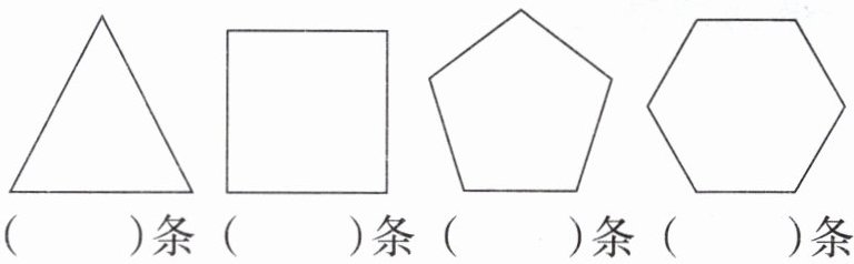 解析:本题主要考查轴对称图形对称轴数量的判断。对于等边三角形,沿三条高所在的直线对折后,直线两侧的部分都能完全重合,所以有$3$条对称轴;正方形沿两组对边中点连线以及两条对角线对折后,直线两侧的部分都能完全重合,所以有$4$条对称轴;正五边形沿过顶点与对边中点的$5$条直线对折后,直线两侧的部分都能完全重合,所以有$5$条对称轴;正六边形沿过对边中点的$3$条直线以及过相对顶点的$3$条直线对折后,直线两侧的部分都能完全重合,所以有$6$条对称轴。