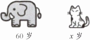 解析:本题考查利用倍数关系列方程解决问题。已知大象年龄是小猫年龄的$5$倍,小猫年龄为$x$岁,那么大象年龄就是$5x$岁,又已知大象年龄为$60$岁,可据此列出方程。