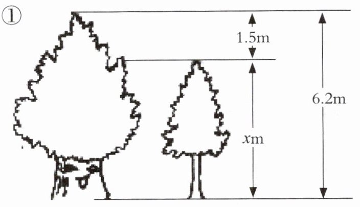 ①解析:考查利用线段图找等量关系,列方程并求解。左边树的的高度是$x$米,右边树比左边树高$1.5$米,两棵树总高度为$6.2$米,