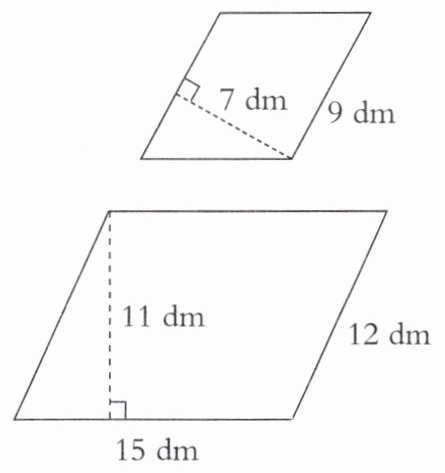 对于第二个平行四边形,已知底为$15dm$,对应的高为$11dm$,同样代入公式求出面积。