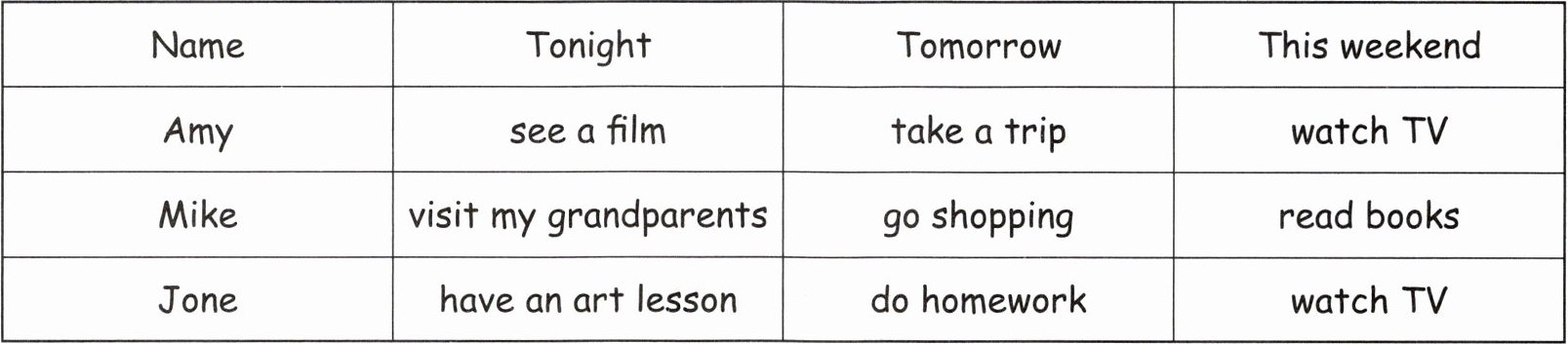 1. He is going to read books. 2. No, she isn't. 3. visit his grandparents 4. They are going to watch TV.