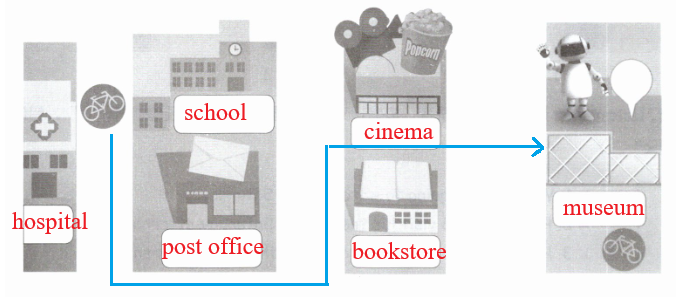 Today, I want to go to the museum by bike. From my school I go straight and turn left at the post office. I can see the bookstore there. From there I turn left and go straight ahead. Then, at the cinema I turn right. Finally, I'm at the museum.