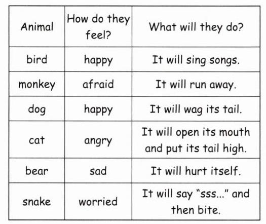 When a bird is happy, it will sing songs. When a monkey is afraid of you, it will run away. When a dog is happy, it will wag (来回摇摆) its tail. When a cat is angry, it will open its mouth and put its tail high. When a bear is sad, it will hurt itself. When a snake is worried, it will say "sss..." and then bite (咬).