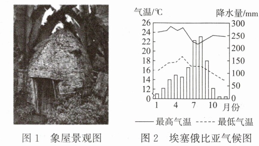 草屋是埃塞俄比亚特色民居,整体采用竹子和芭蕉叶编织而成,借助高大的竹竿架起,外面再覆盖一层防雨的竹叶,建成后形如一头大象,故又称“象屋”(图1)。“象屋”必须在干燥季节建造,由于白蚁的侵蚀以及潮湿地面的腐蚀,每隔三年就要整理一次。