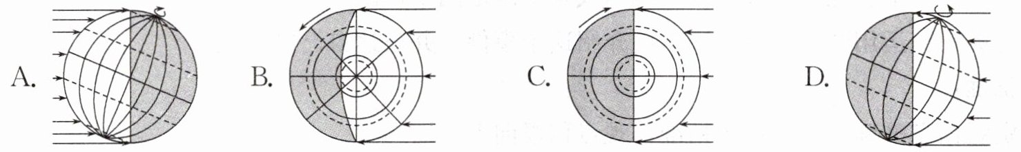 3. 地球公转到图中冬至日位置时,下列太阳光照图正确的是(
