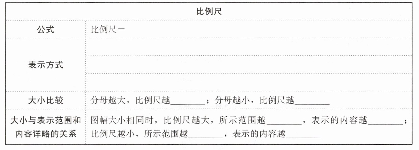 2.公式:图上距离/实地距离;表示方式:数字式、文字式、线段式;大小比较:小;大;大小与范围和内容详略的关系:小;详细;大;简略