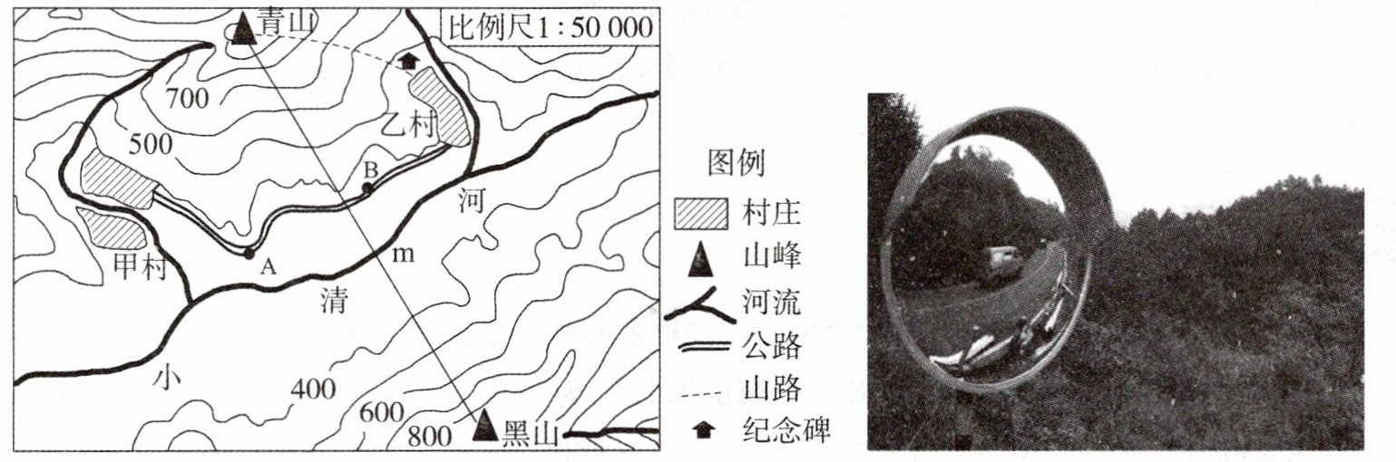 2. 同学们从甲村出发沿公路到乙村附近瞻仰烈士纪念碑,缅怀革命先烈。行程中,同学们发现路边立有一个凸面镜(如右图),你认为凸面镜最大可能位于左图中 A、B 两点中的哪一点。A。