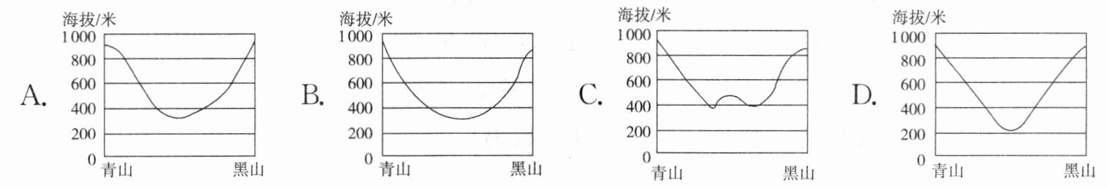 5. 野外实践活动结束后,同学们绘制了图中沿 m 线的地形剖面图。以下剖面图中,与实际最吻合的是( B