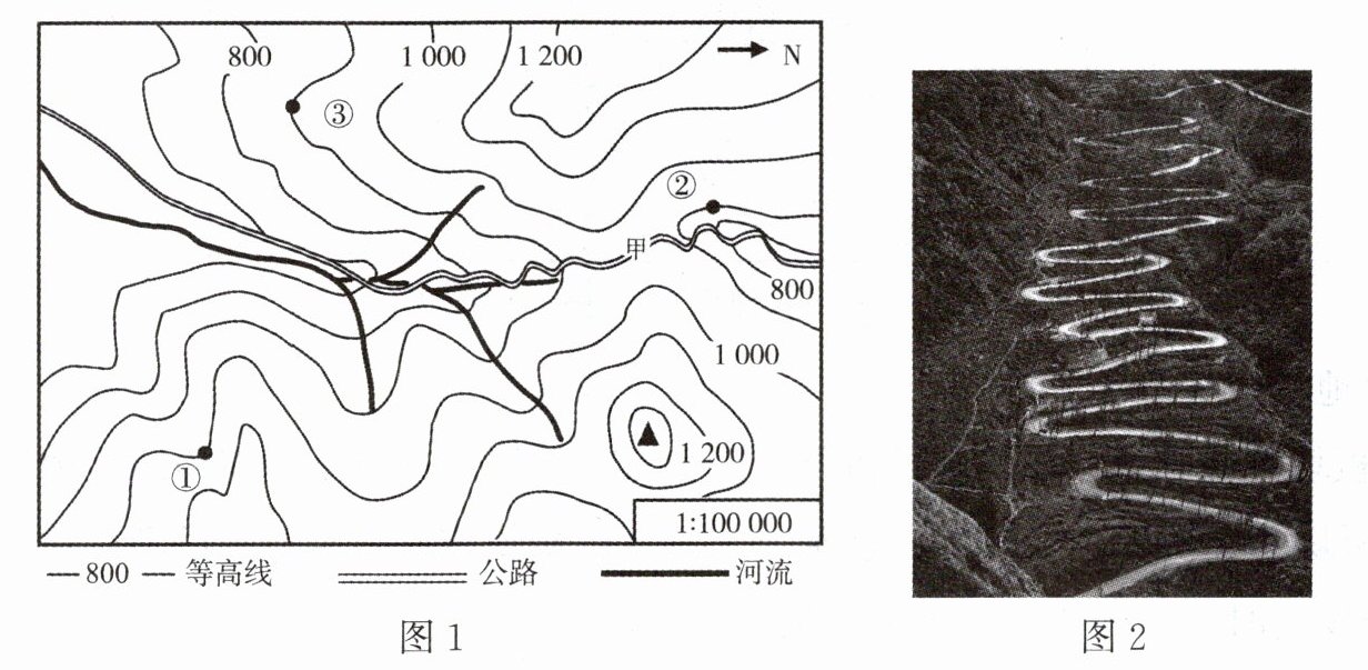 (1)1 000 1 300 (2)① ①地等高线的分布更为密集 (3)甲地等高线稀疏,坡度较小,施工难度较小。 (4)减缓坡度