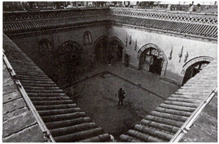 地坑院建造在土源之上,即在地面向下挖一个深达6~10米的巨形四方大坑,再于地坑中四壁开凿窑洞,构成布局类似于北京四合院的地下窑洞式住宅,堪称因地制宜的建筑典范。河南三门峡市庙上村是我国地坑院保存最完好的村落,“进村不见房,闻声不见人”。下图为庙上村地坑院景观图。据此,完成8~10题。