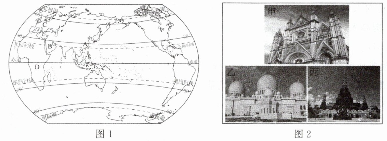 图2中(甲/乙/丙)图所示宗教。(3)图1中C地所在地区,居民大多信奉