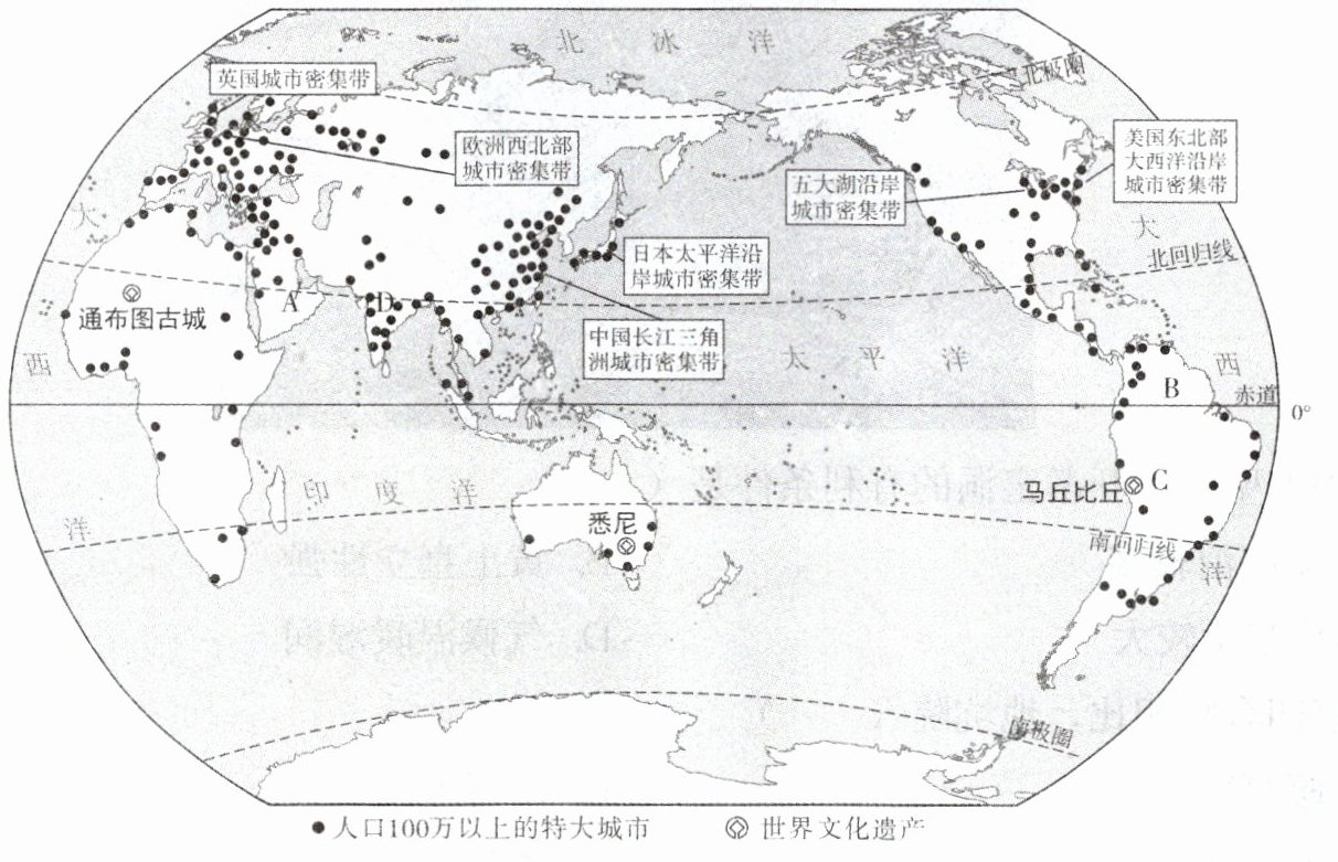 12. 读人口100万以上的特大城市及部分世界文化遗产分布图,完成下列问题。