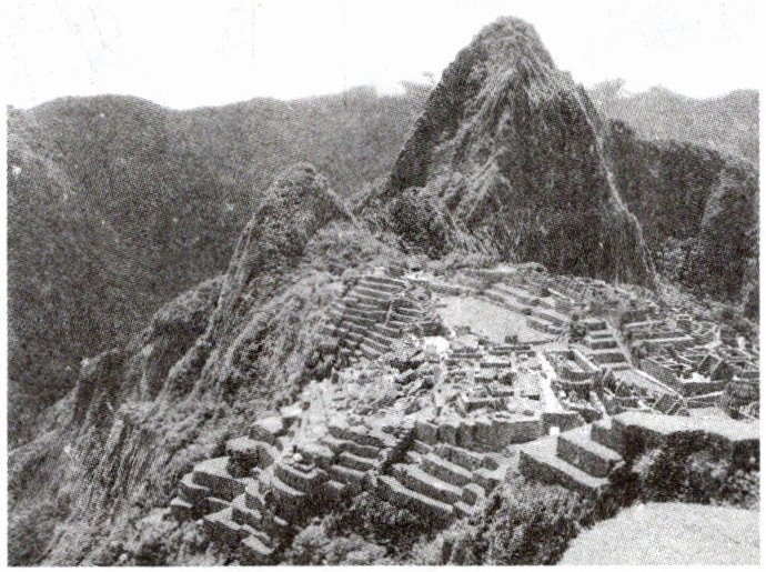 (3)图中字母C处所在的马丘比丘古城遗址(下图)位于秘鲁库斯科西北约110千米处,在安第斯山脉西南部马丘比丘山和胡亚拉比丘两座山峰之间的一个马鞍形山脊上。1983年,联合国教科文组织根据世界文化遗产遴选标准,将其列为文化与自然双重遗产。