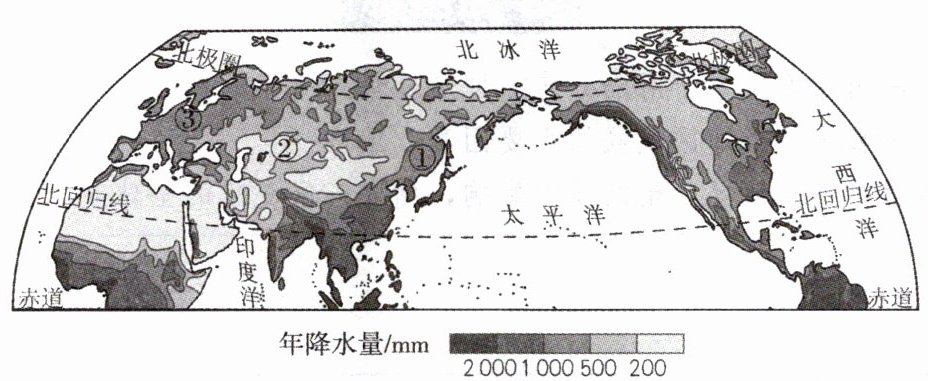 3. 下图为北半球年降水量分布图,对比图中①②③地年降水量的差异,归纳世界降水的分布特点(