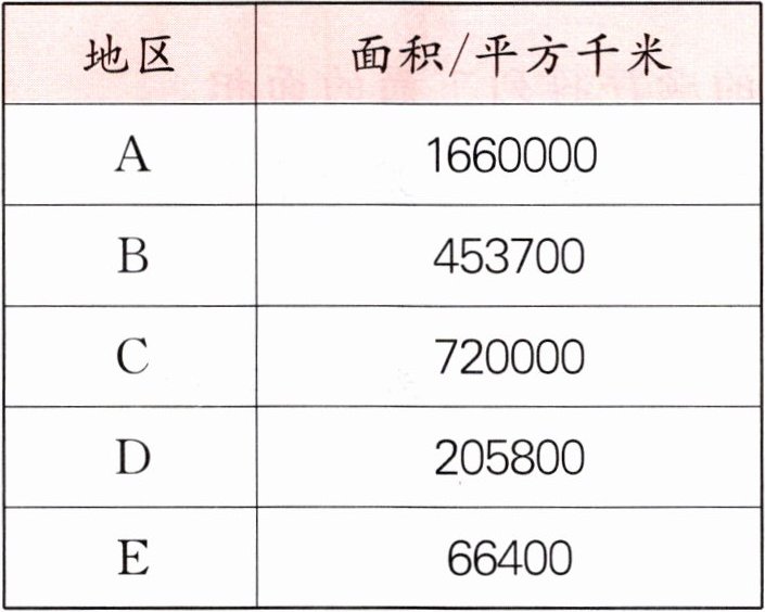 E地区面积是五位数,D地区和B地区面积是六位数,C地区和A地区面积是七位数。