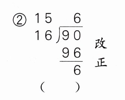 ×,改正:$\begin{array}{r}90÷ 16 =\boxed{5}\cdots\cdots \boxed{10}\\16\enclose{longdiv} {90}\\80\\\hline10\end{array}$