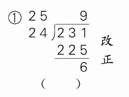 ×,改正:$\begin{array}{r}231 ÷ 24 =\boxed{9}\cdots\cdots \boxed{15}\\24\enclose{longdiv} {231}\\216\\\hline15\end{array}$