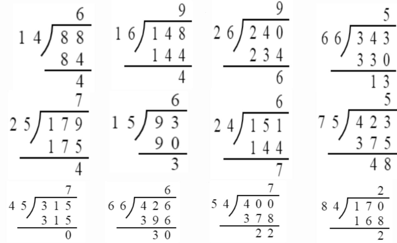 考查了除法的基本运算,包括试商、乘法和减法步骤的正确执行,以及对余数的正确处理。