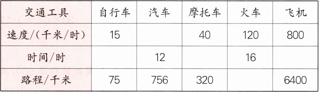 在表格中,已知不同交通工具的速度和路程或者时间,根据公式:$\text{路程} = \text{速度} × \text{时间}$,$\text{时间} = \text{路程} ÷ \text{速度}$,$\text{速度} = \text{路程} ÷ \text{时间}$来计算空白处的内容。
