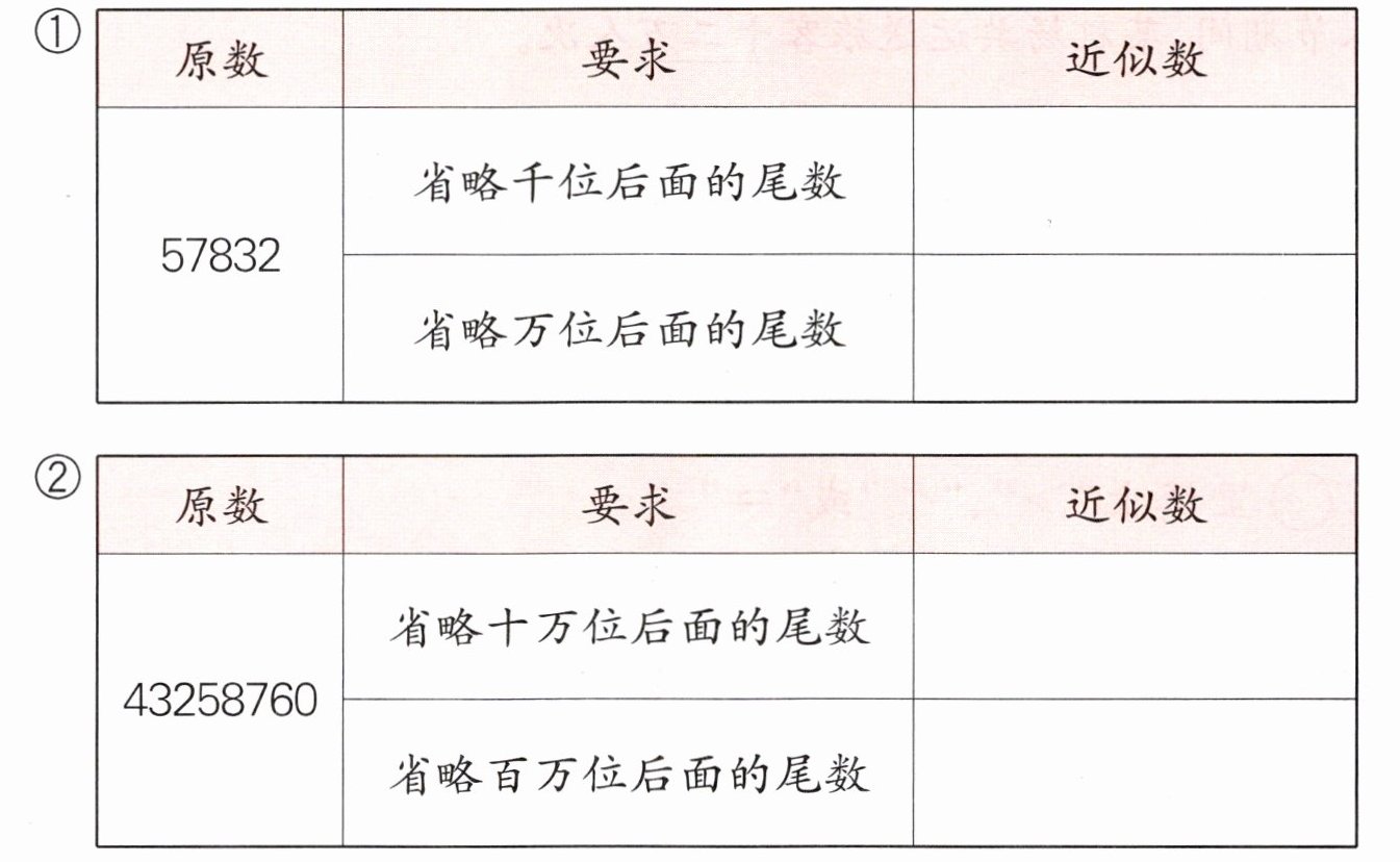 ① 57832省略千位后面的尾数,则看百位上的数字,百位是8,大于5,所以千位上的7加1等于8,因此57832省略千位后面的尾数近似为58000。