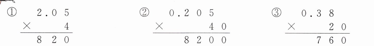 ②$0.205$有三位小数,$40$是整数,可以先看作$4$,在积的末尾添上一个$0$,所以积有三位小数,末尾的$0$可以省略。
