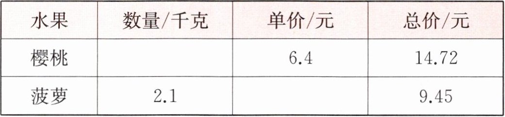 樱桃的数量:$总价 ÷ 单价=14.72 ÷ 6.4=2.3(千克)$;