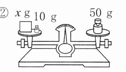 ②图中天平左边是$x$克和$10$克砝码,天平右边是$50$克砝码,天平处于平衡状态,说明左右两边的质量相等。