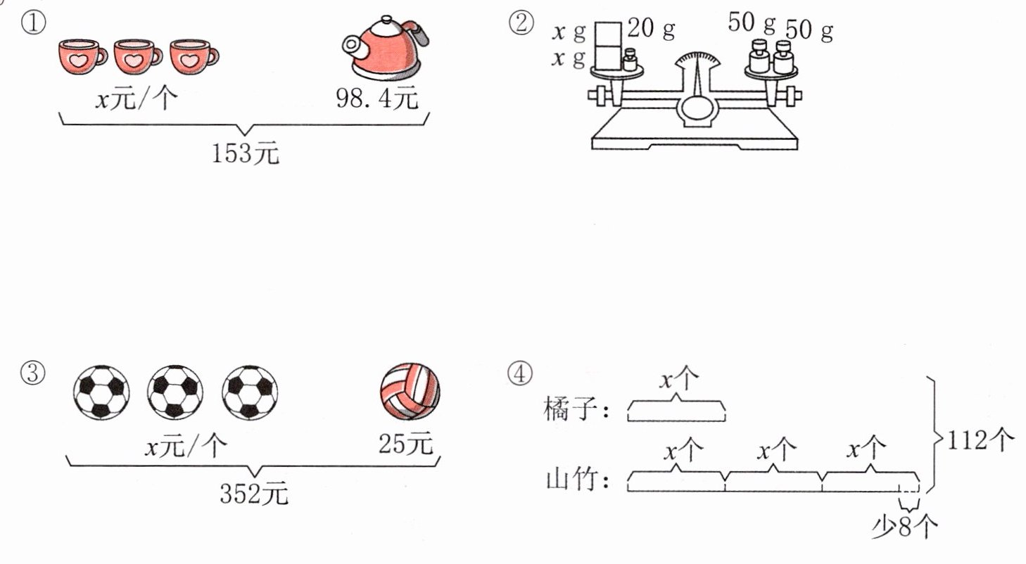 ①解析:考查利用方程解决实际问题。3个茶杯和一个茶壶总共153元,茶壶98.4元,设茶杯每个$x$元,根据总价=单价×数量,可列方程$3x+98.4=153$。