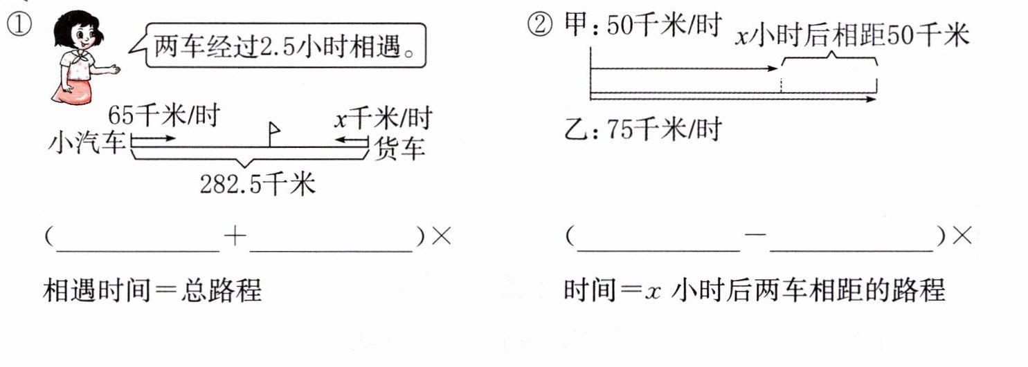 🐦2 看图把下面的等量关系式补充完整,再列出方程求解。