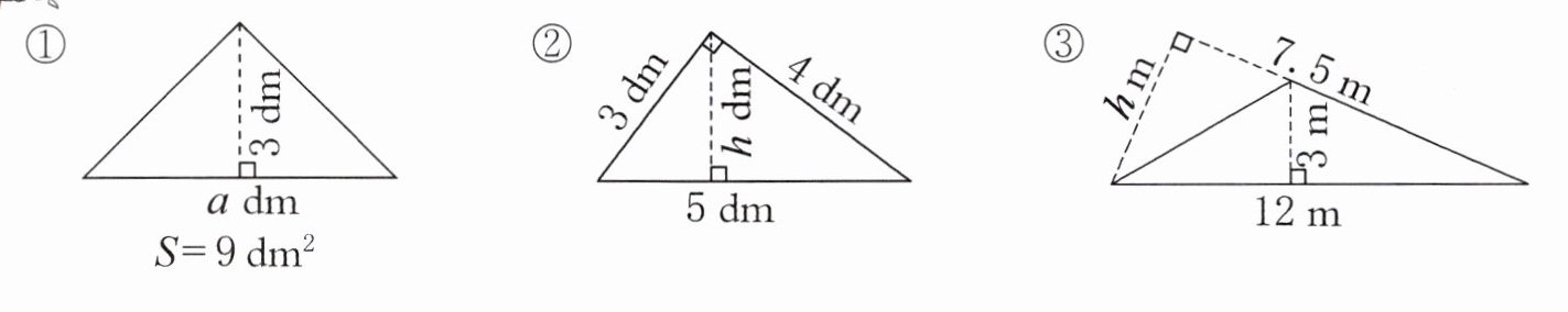 ①已知面积$S = 9dm^{2}$,高$h = 3dm$,根据公式$a = 2S÷ h$可求出底$a$的值。