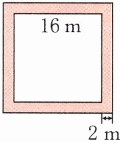 ② 有一个边长为16 m的正方形花坛,在它的四周有一条宽2 m的小路(如下图)。小路的面积是多少?