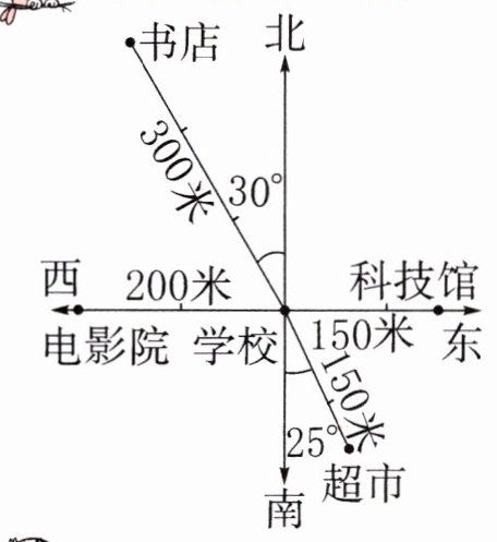 ③书店在学校的北偏西$30^\circ$方向上,距离是$300$米。