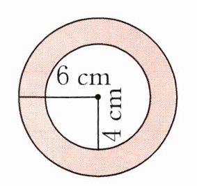 圆环的面积:$S=\pi(R^2 - r^2)=3.14×(6^2 - 4^2)=62.8cm^2$