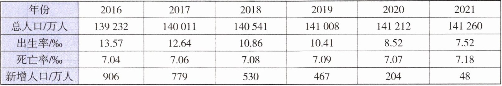 材料 人口问题对社会经济发展影响巨大。2021年5月,我国实施“三孩”生育政策,即一对夫妇可以生育三个子女。下表为2016—2021年我国人口统计数据表。