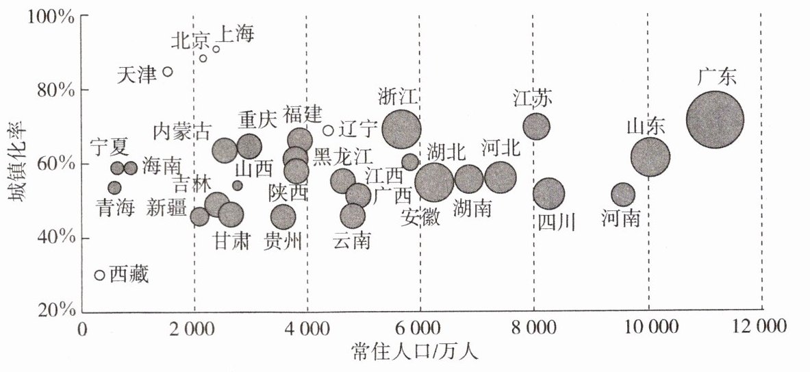 4. 右图为某年我国大陆31个省级行政区常住人口及城镇化率统计图,实心圆圈表示一年中人口增加,空心圆圈表示人口减少,圆圈越大,表示增量或减量越大。读图,回答6—8题。