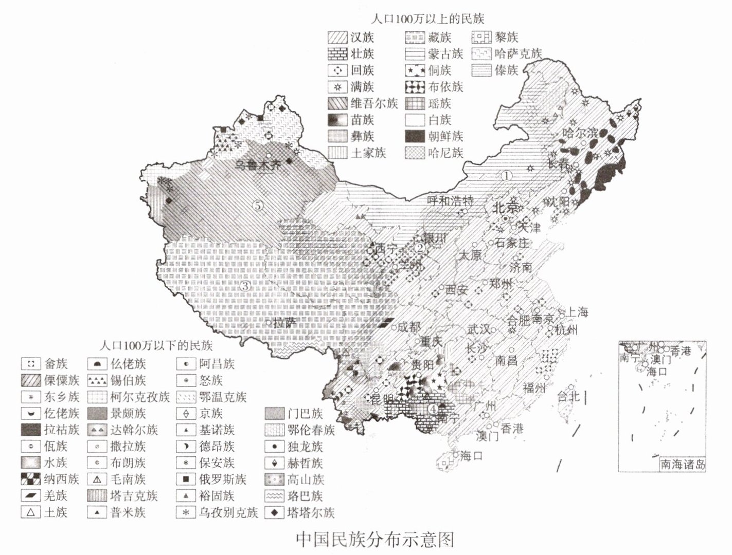 (1)①内蒙古 ②宁夏回族 ③西藏 ④广西壮族 ⑤新疆维吾尔 (2)新疆维吾尔 (3)大杂居、小聚居、交错居住 汉 (4)蒙古
