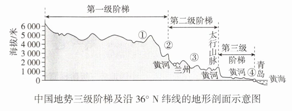 读中国地势三级阶梯及沿 36°N 纬线的地形剖面示意图,回答 2、3 题。
